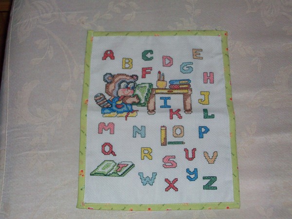 Très beau cadre. Les enfants vont vite apprendre l'alphabet.La couleur du biais est très assortie. Bravo.Amitiés.